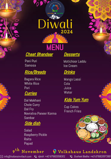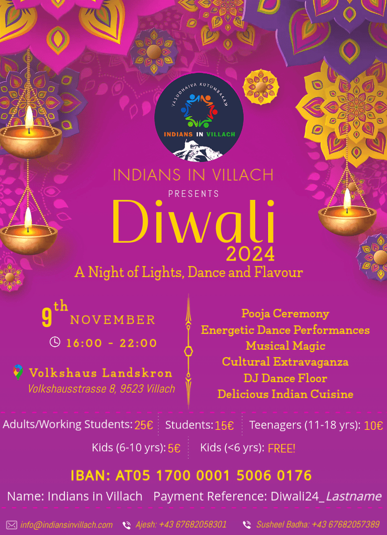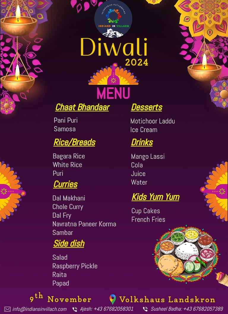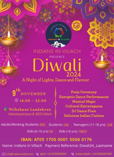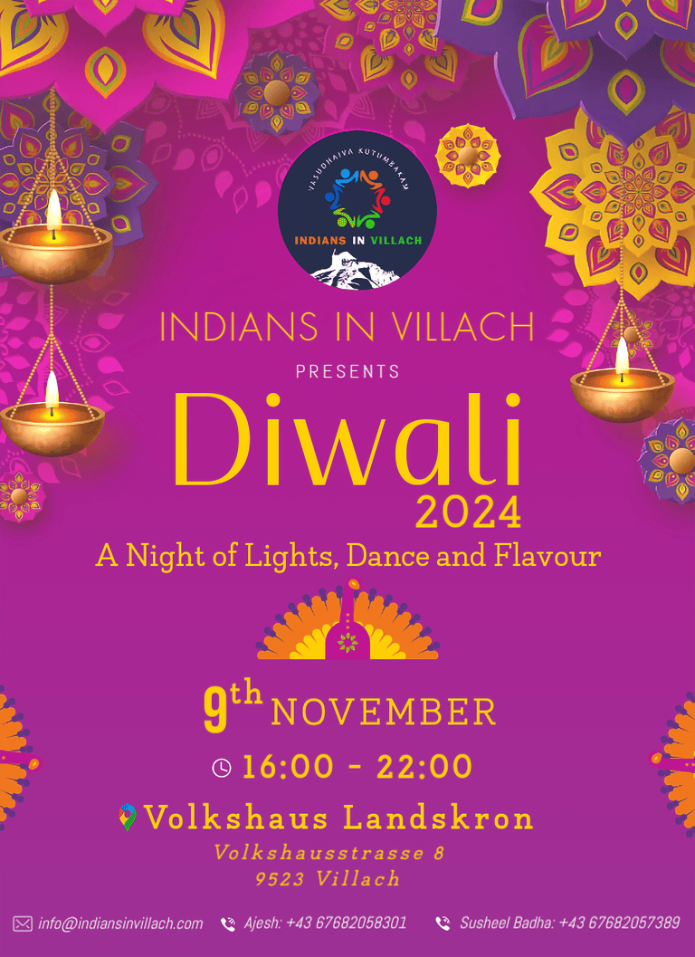 “Wish to meet your fellow Indians in Villach? Want to connect to your home away from home? Come, let us celebrate together Diwali 24 on 9th November”
